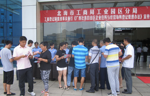 在中國(guó)電子北海產(chǎn)業(yè)園宣傳現(xiàn)場(chǎng),工業(yè)園區(qū)工商分局負(fù)責(zé)人表示,“從材料的申請(qǐng)?zhí)峤恢赁k證,承諾為期7個(gè)工作日辦好,根據(jù)園區(qū)的優(yōu)質(zhì)企業(yè),特事特辦,急事急辦,材料齊全的即可當(dāng)天頒證。”據(jù)了解,此次政策免去驗(yàn)資等手續(xù),不但節(jié)約時(shí)間,還降低企業(yè)成本。中國(guó)電子北海產(chǎn)業(yè)園園區(qū)企業(yè)北海高創(chuàng)電子信息孵化器有限公司領(lǐng)到了新版營(yíng)業(yè)執(zhí)照,新版由以前的橫版改為豎版,沒有了實(shí)收資本一項(xiàng),并且左下角有一個(gè)二維碼,掃描成功后就能看到企業(yè)名稱、法人、注冊(cè)時(shí)間等登記信息。工作人員表示,“這次工商登記制度改革對(duì)于創(chuàng)業(yè)者最大的實(shí)惠就是注冊(cè)資本由實(shí)繳改為認(rèn)繳登記,企業(yè)籌集資金的壓力就小了很多。而且現(xiàn)在辦理執(zhí)照不需要再提供驗(yàn)資報(bào)告等各種材料,只提供場(chǎng)地證明、公司章程就可以申請(qǐng)?jiān)O(shè)立登記,提交的資料簡(jiǎn)化了,手續(xù)自然就簡(jiǎn)單便捷了,從人員的招募到辦理登記,節(jié)省了幾個(gè)月的時(shí)間。”北部灣電子信息科技企業(yè)孵化器的創(chuàng)業(yè)青年者紛紛前來咨詢,工業(yè)園區(qū)工商分局熱情、細(xì)致地為咨詢者解惑,同時(shí)發(fā)放了申辦宣傳材料,為創(chuàng)業(yè)者們提供專業(yè)、便捷、高效的全方位咨詢服務(wù)。
