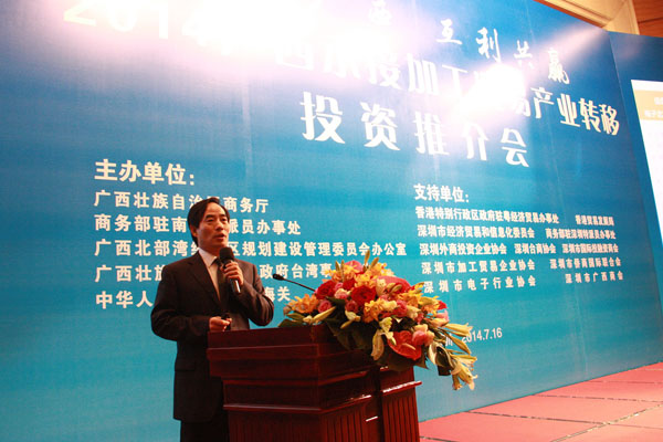 2014年7月16日,由自治區(qū)商務(wù)廳主辦的2014廣西承接加工貿(mào)易產(chǎn)業(yè)轉(zhuǎn)移投資推介會(huì)在深圳舉行。自治區(qū)政府副秘書長魏然,深圳市經(jīng)濟(jì)貿(mào)易和信息化委員會(huì)副主任高林等領(lǐng)導(dǎo)和嘉賓為會(huì)議致辭。自治區(qū)商務(wù)廳、北部灣辦分別從不同角度對(duì)廣西承接加工貿(mào)易產(chǎn)業(yè)轉(zhuǎn)移投資環(huán)境進(jìn)行了推介。北海、欽州、梧州、南寧四個(gè)國家級(jí)加工貿(mào)易梯度轉(zhuǎn)移重點(diǎn)承接地,欽州保稅港區(qū)、憑祥綜合保稅區(qū)、北海出口加工區(qū)、中馬欽州產(chǎn)業(yè)園、東興國家重點(diǎn)開發(fā)開放試驗(yàn)區(qū)、南寧高新技術(shù)產(chǎn)業(yè)開發(fā)區(qū)、中國電子北海產(chǎn)業(yè)園、梧州市粵桂合作特別實(shí)驗(yàn)區(qū)八個(gè)重點(diǎn)園區(qū),分別就各自的產(chǎn)業(yè)布局、投資環(huán)境、政策優(yōu)勢(shì)進(jìn)行了推介。香港特區(qū)政府駐粵辦、香港貿(mào)易發(fā)展局、深圳外商投資企業(yè)協(xié)會(huì)、深圳臺(tái)商協(xié)會(huì)、深圳市加工貿(mào)易企業(yè)協(xié)會(huì)、深圳市企業(yè)聯(lián)合會(huì)、深圳市電子行業(yè)協(xié)會(huì)及廣東各類加工貿(mào)易企業(yè)約400人出席了推介會(huì)。
