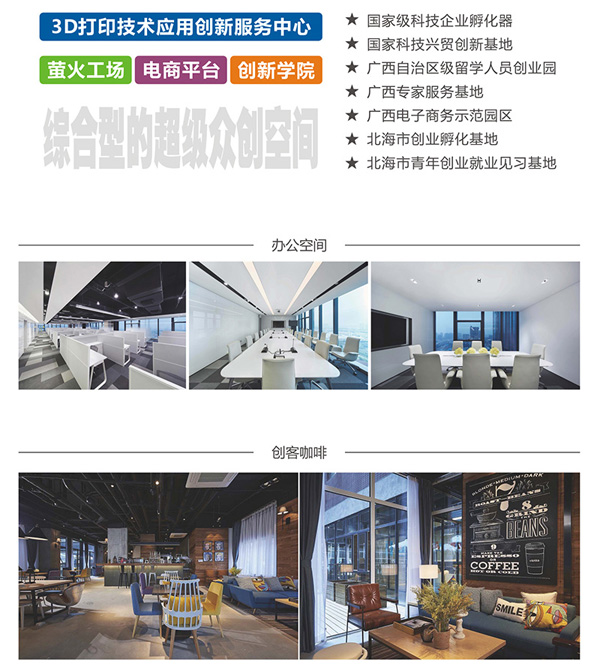 中電北海產業(yè)園眾創(chuàng)空間規(guī)劃面積5000平方米,重點圍繞智慧城市、智能硬件、物聯(lián)網、移動互聯(lián)網、大數(shù)據、電子商務等重點新型產業(yè)領域,采取互聯(lián)網+現(xiàn)場服務的模式,整合上下游資源,為入住企業(yè)和創(chuàng)業(yè)者提供政策咨詢、科研支持、人才引進、電商培訓、創(chuàng)業(yè)指導、融資對接等服務,形成支持創(chuàng)新創(chuàng)業(yè)的生態(tài)圈。中電北海產業(yè)園眾創(chuàng)空間通過整合各方資源,已經集成一批面向區(qū)域主導產業(yè)的前沿技術,整合了戰(zhàn)略投資基金、天使基金和社會投資相結合的創(chuàng)新創(chuàng)業(yè)投資基金,建立了涵蓋科學家、創(chuàng)業(yè)企業(yè)家和企業(yè)運營管理專家的創(chuàng)業(yè)導師團隊,聚集電商平臺、3D打印技術應用創(chuàng)新服務中心、創(chuàng)新學院、螢火工場實驗室等一體化服務機構構成綜合型的超級眾創(chuàng)空間。